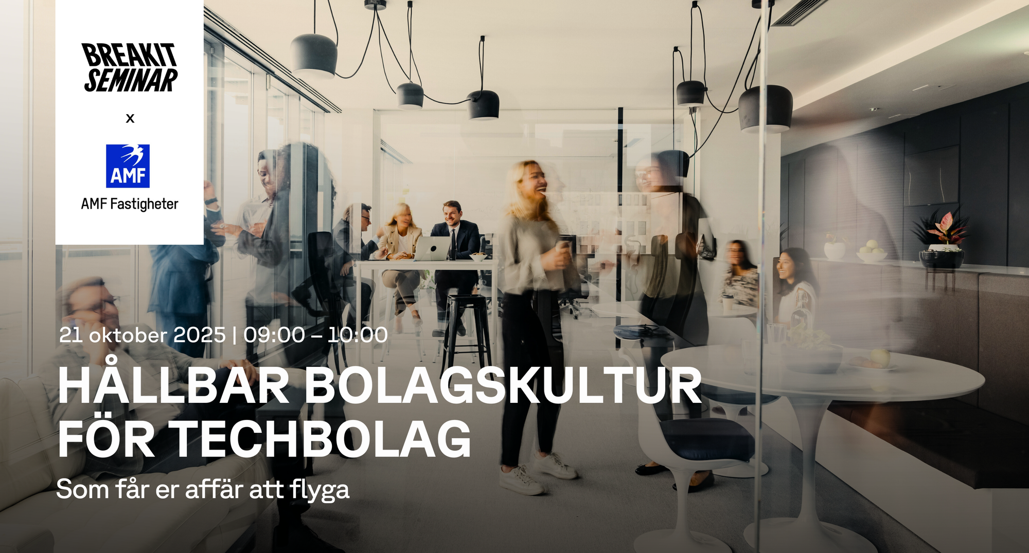 Välkommen på ett kostnadsfritt frukostseminarium med Breakit och AMF Fastigheter om hållbar bolagskultur för techbolag, den 21 oktober klockan 09:00–10:00. Frukost serveras från klockan 08:30.